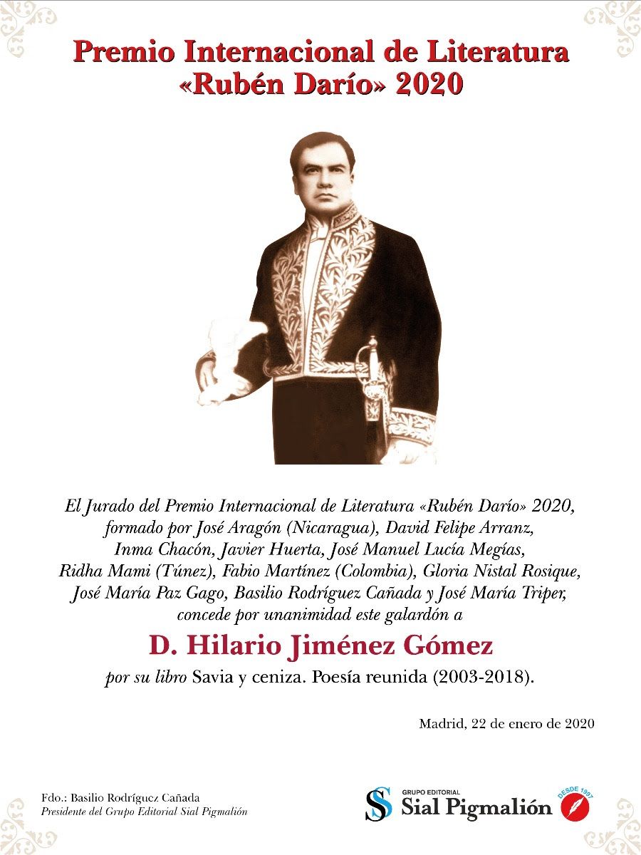 El jurado del Premio Internacional de Literatura “Rubén Darío” 2020, formado por José Aragón (Nicaragua), David Felipe Arranz, Inma Chacón, Javier Huerta, José Manuel Lucía Megías, Ridha Mami (Túnez), Fabio Martínez (Colombia), Gloria Nistal Rosique, José María Paz Gago y Basilio Rodríguez Cañada, concede por unanimidad este galardón al profesor y escritor extremeño Hilario Jiménez Gómez, por su libro Savia y ceniza. Poesía reunida (2003-2018).