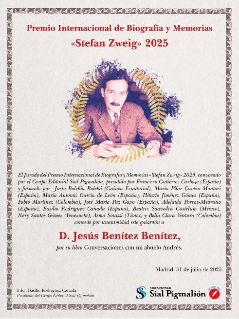 El jurado de la convocatoria del premio de 2025 ha estado presidido por el catedrático universitario y escritor Francisco Gutiérrez Carbajo (España) y formado por Justo Bolekia Boleká (Guinea Ecuatorial), María Pilar Cavero Montori (España), María Antonia García de León (España), Hilario Jiménez Gómez (España), Fabio Martínez (Colombia), José María Paz Gago (España), Adelaida Porras-Medrano (España), Basilio Rodríguez Cañada (España), Beatriz Saavedra Gastélum (México), Nery Santos Gómez (Venezuela), Asma Souissi (Túnez) y Bella Clara Ventura (Colombia), y concede por unanimidad este galardón a D. Jesús Benítez Benítez, por su libro Conversaciones con mi abuelo Andrés.