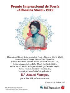 En 2019, un jurado internacional formado por José Luis “Marín Aranda” (España), María Antonia García de León (España), José Luis López Amigo (España), Ridha Mami (Túnez), Luz Stella Millán (Colombia), Gloria Nistal Rosique (España), Basilio Rodríguez Cañada (España), José Ramón Trujillo (España), Carlos Vásquez-Zawadzki (Colombia) y Ondina Zea (Honduras), concede por unanimidad este galardón a la poeta venezolana D.ª Amarú Vanegas, por su libro Añil y el conjunto de su obra.