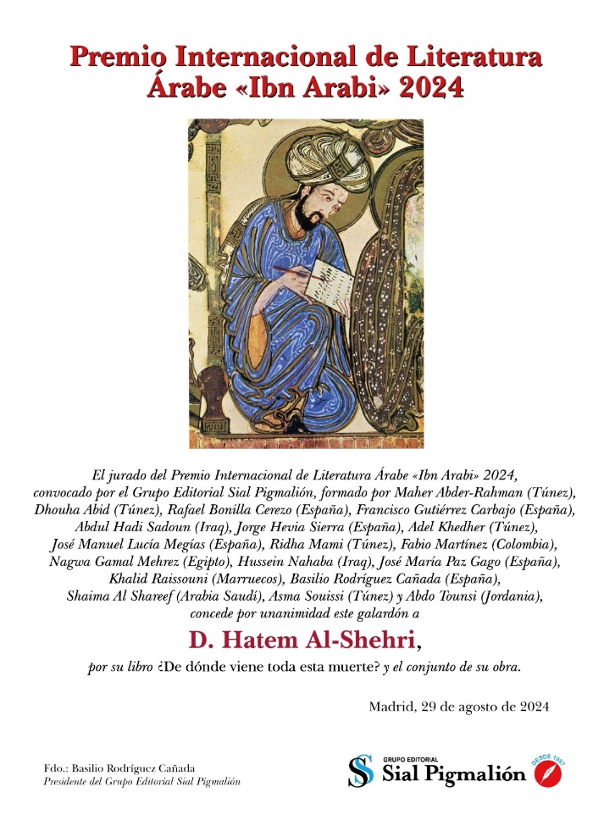 El jurado de la convocatoria del premio correspondiente a 2024 ha estado formado por Maher Abder-Rahman (Túnez), Dhouha Abid (Túnez), Rafael Bonilla Cerezo (España), Francisco Gutiérrez Carbajo (España), Abdul Hadi Sadoun (Iraq), Jorge Hevia Sierra (España), Adel Khedher (Túnez), José Manuel Lucía Megías (España), Ridha Mami (Túnez), Fabio Martínez (Colombia), Nagwa Gamal Mehrez (Egipto), Hussein Nahaba (Iraq), José María Paz Gago (España), Khalid Raissouni (Marruecos), Basilio Rodríguez Cañada (España), Shaima Al Shareef (Arabia Saudita), Asma Souissi (Túnez) y Abdo Tounsi (Jordania) concede por unanimidad este galardón a D. Hatem Al-Shehri, por su libro ¿De dónde viene toda esta muerte? y el conjunto de su obra.