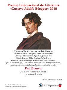 El jurado del Premio Internacional de Literatura “Gustavo Adolfo Bécquer” 2019, formado por Vicente Araguas (España), Sol de Diego (España), Francisco Gutiérrez Carbajo (España), Lidia Corcione (Colombia), Fabio Martínez (Colombia), Ridha Mami (Túnez), José María Paz Gago (España), Xosé Antonio Perozo (España) y Basilio Rodríguez Cañada, concede por unanimidad este galardón al periodista y poeta gallego Pati Blanco, por su libro Miradas que hablan y el conjunto de su obra.
