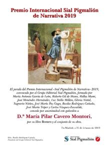 Y, en 2019, un jurado internacional, formado por: M.ª Antonia García de León (España), Roberto Gil de Mares (Colombia), Ridha Mami (Túnez), José Menéndez Hernández (España), Luz Stella Millán (Colombia), Gloria Nistal (España), Sagrario Núñez (España), José María Paz Gago (España), Basilio Rodríguez Cañada (España), José María Triper (España) y Carlos Vásquez-Zawadzki (Colombia) decidió, por unanimidad, conceder este galardón a la escritora española M.ª Pilar Cavero Montori, por su novela Romeoy el conjunto de su obra.