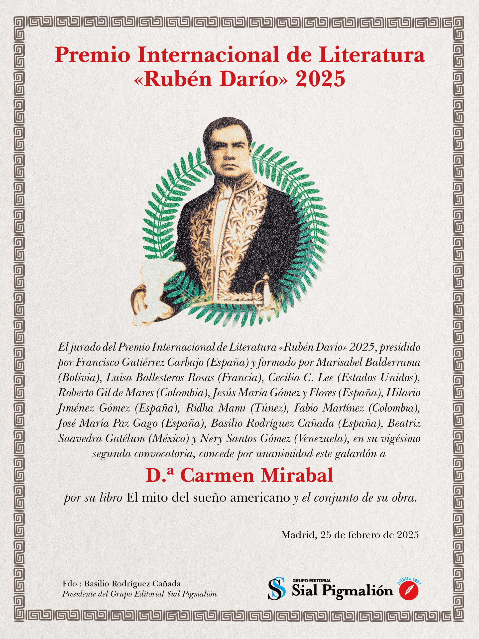 El jurado del Premio Internacional de Literatura “Rubén Darío” 2025, en su vigésima tercera convocatoria, presidido por Francisco Gutiérrez Carbajo (España) y formado por Marisabel Balderrama (Bolivia), Luisa Ballesteros Rosas (Francia), Cecilia C. Lee (Estados Unidos), Roberto Gil de Mares (Colombia), Jesús María Gómez y Flores (España), Hilario Jiménez Gómez (España), Ridha Mami (Túnez), Fabio Martínez (Colombia), José María Paz Gago (España), Basilio Rodríguez Cañada (España), Beatriz Saavedra Gastélum (México) y Nery Santos Gómez (Venezuela), concede por unanimidad este galardón al poeta extremeño Carmen Mirabal, por su libro El mito del sueño americano y el conjunto de su obra.