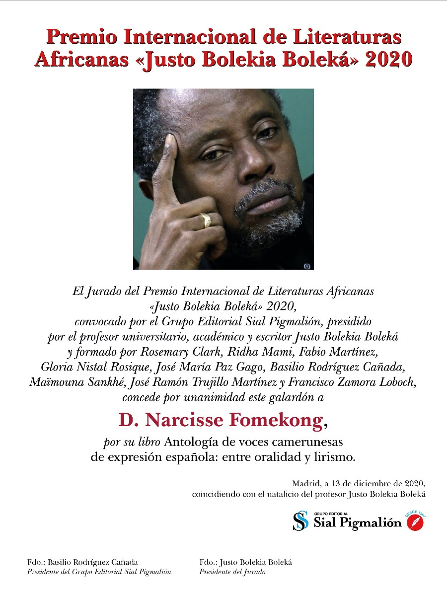 El Premio Internacional de Literaturas Africanas “JustoBolekia Boleká” se crea en 2017 por el Grupo Editorial Sial Pigmalión, coincidiendo con el vigésimo aniversario de la fundación del grupo, para premiar a autores africanos o afrodescendientes de todo el mundo que hayan destacado como poetas, narradores, ensayistas, hispanistas o traductores. Un jurado prestigioso propondrá cada año a autores afro que se hayan distinguido en diferentes géneros literarios, y otorgará este galardón, que reivindica la figura del profesor universitario, académico y escritor hispanoafricano, JustoBolekia Boleká, natural de Guinea Ecuatorial y residente en España, uno de los escritores africanos actuales más prestigiosos y reconocidos internacionalmente. La obra premiada se publicará en la colección “Casa de África” y se presentará en la Feria del Libro de Madrid así como en importantes eventos literarios en África y América. En la primera convocatoria del premio se reconoció la obra del escritor y periodista afrocolombiano Medardo Arias Satizábal, en 2018 a la escritora guineoecuatoriana Trifonia Melibea Obono y en 2019 a la escritora africana afincada en España Ángela Nzambi. El jurado de esta cuarta convocatoria del premio ha estado presidido por JustoBolekia Boleká y formado por Rosemary Clark, Ridha Mami, Fabio Martínez, Gloria Nistal Rosique, José María Paz Gago, Basilio Rodríguez Cañada, Maïmouna Sankhé, José Ramón Trujillo Martínez y Francisco Zamora Loboch, concediendo por unanimidad este galardón a D. Narcisse Fomekong, por su libro Antología de voces camerunesas de expresión española: entre oralidad y lirismo.