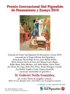 El 18 de septiembre de 2019, un jurado internacional formado por: David Felipe Arranz, Justo Bolekia Boleká, María Antonia García de León, José Manuel Lucía Megías, Ridha Mami, Fabio Martínez, Luz Stella Millán, Gloria Nistal, José María Paz Gago, Pedro Pérez Prieto, Basilio Rodríguez Cañada, José Ramón Trujillo y Carlos Vásquez-Zawadzki, decidió, por unanimidad, conceder este galardón al profesor y escritor Gabriel Neila, por su libro Tierra de acogida y censura. Robert Graves, Kingsley Amis y Alan Sillitoe ante la posguerra española.