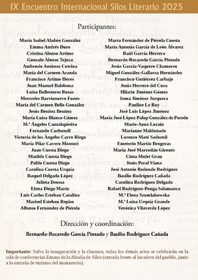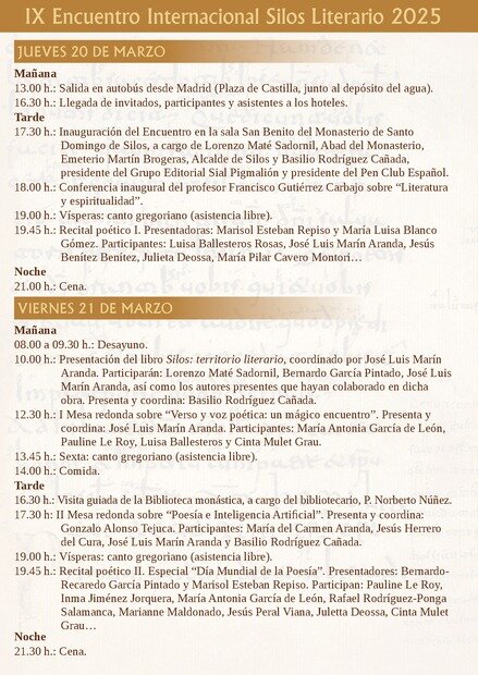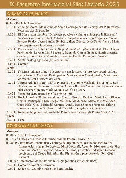 Santo Domingo de Silos se convierte, del 20 al 23 de marzo, en el epicentro de la literatura con la celebración del IX Encuentro Internacional Silos Literario 2025. El evento, organizado por el Grupo Editorial Sial Pigmalión, el Ayuntamiento de Santo Domingo de Silos y la Abadía de Santo Domingo de Silos, reunirá a escritores, poetas y académicos en un enclave de gran valor cultural y espiritual.
